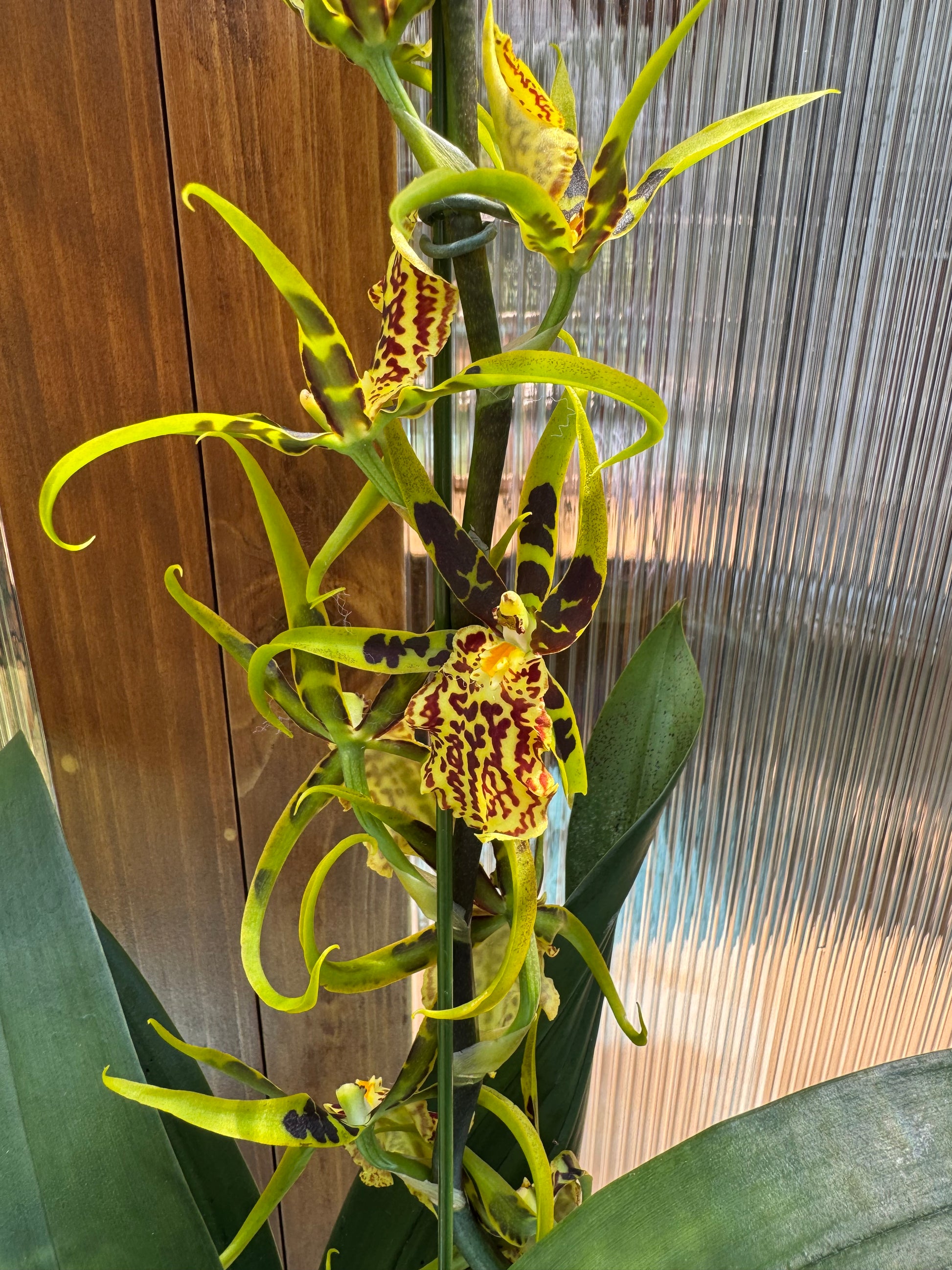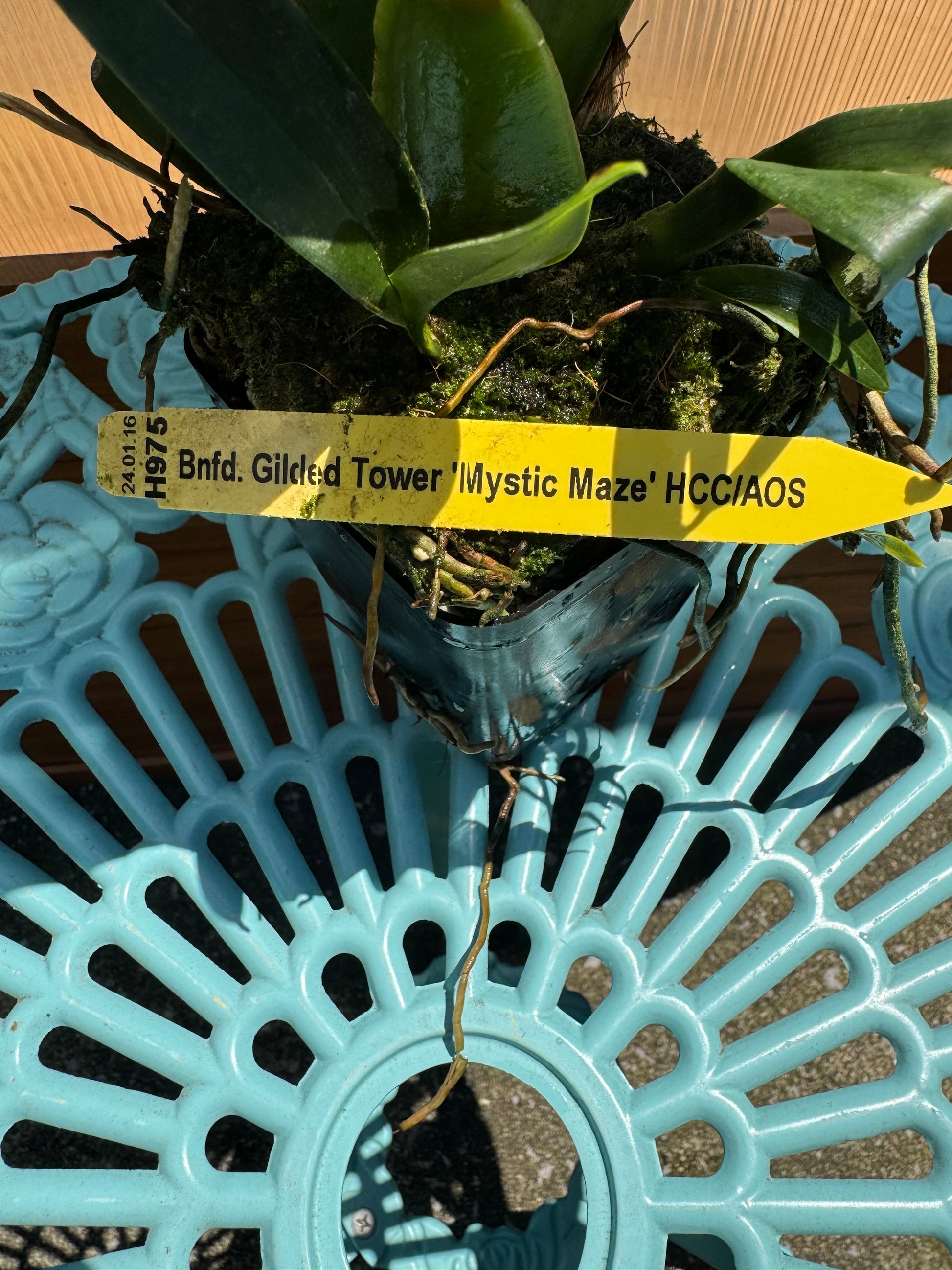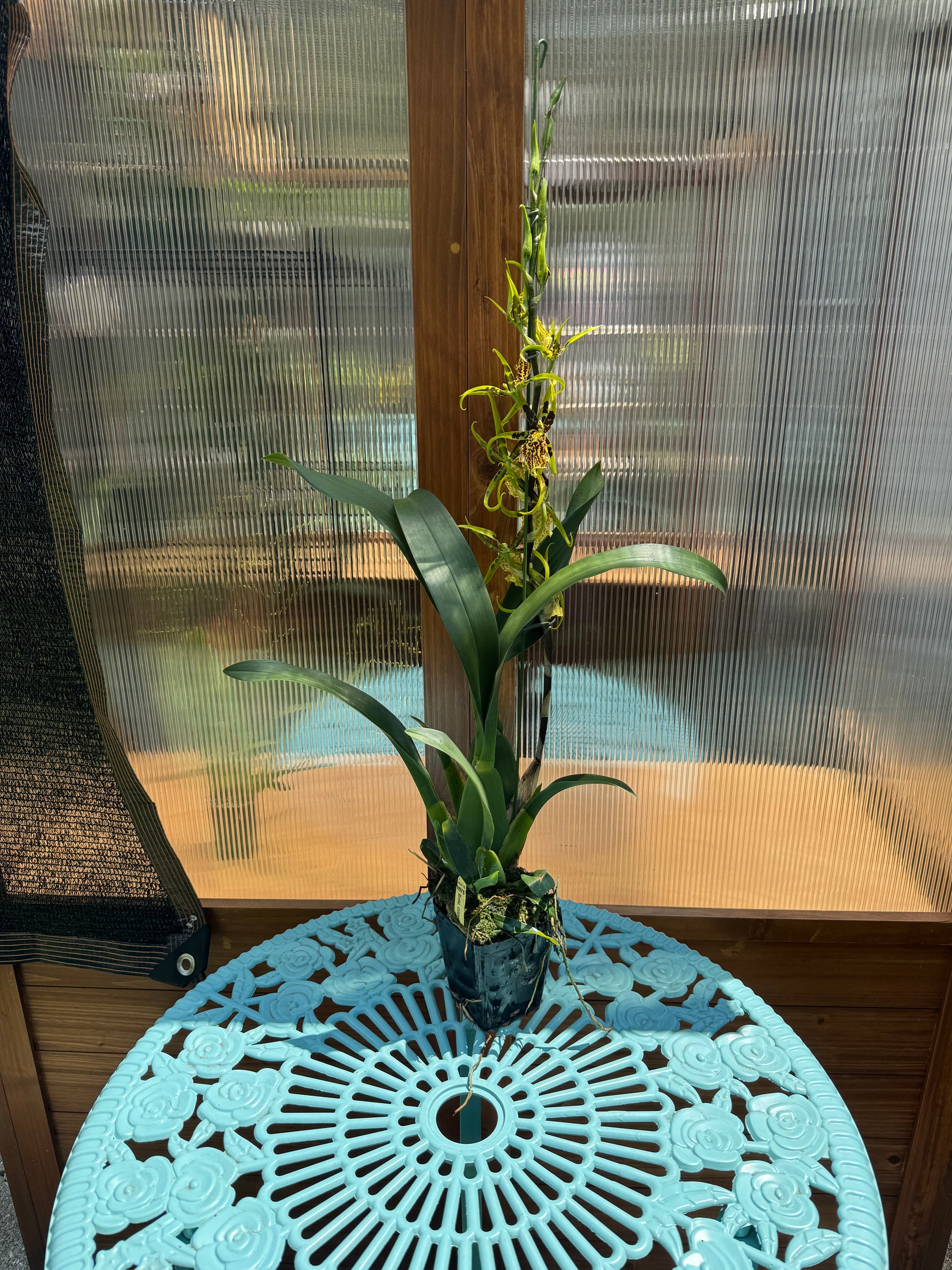 Very showy intergeneric receiving a HCC from the AOS. You can expect long lasting sprays of yellow blooms with mahogany patterns throughout the petals. This orchid will bloom twice a year. This type of Oncidium is prone to black micro dots along the foliage and is completely harmless. 4 inch pot. Intermediate to warm conditions. Ample amount of moisture.